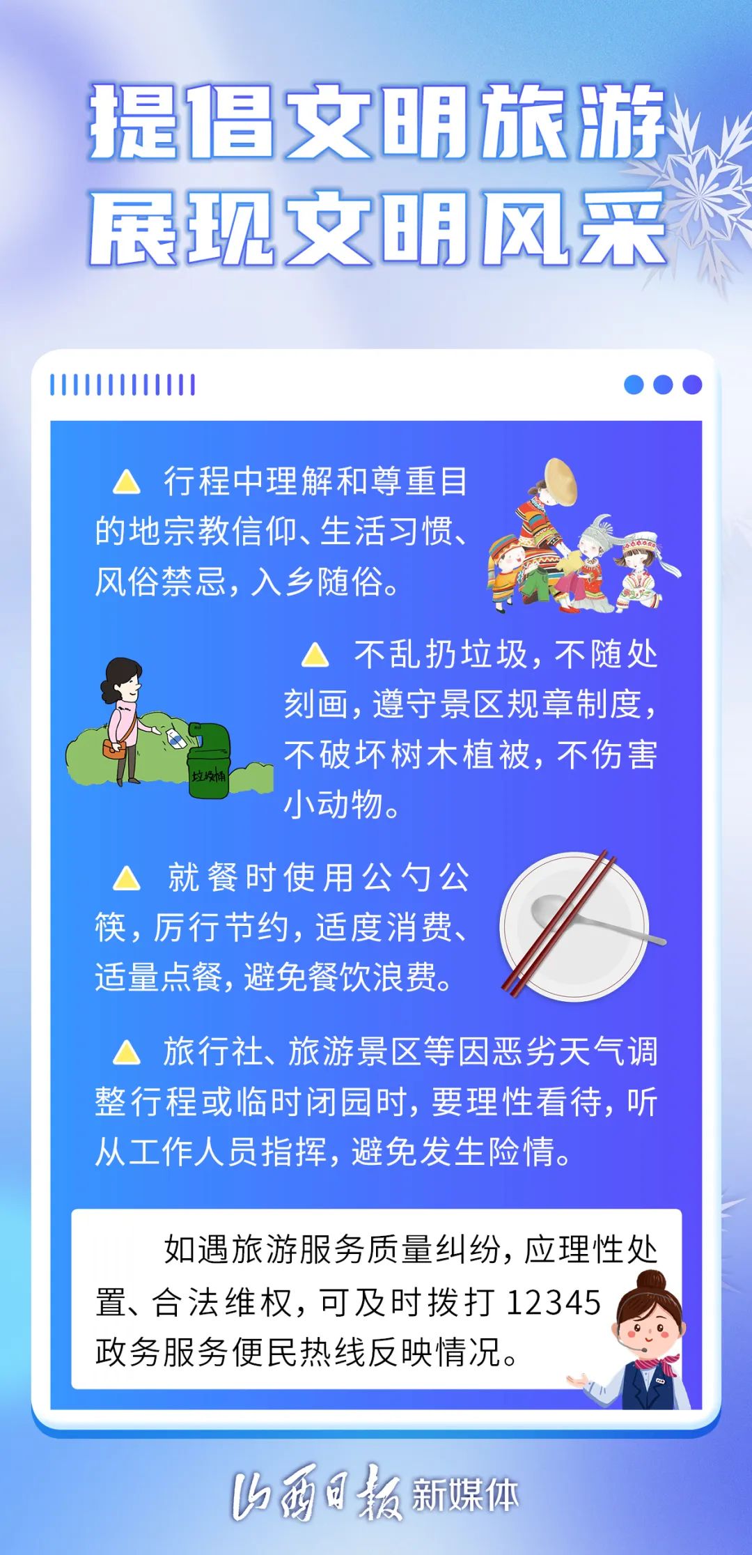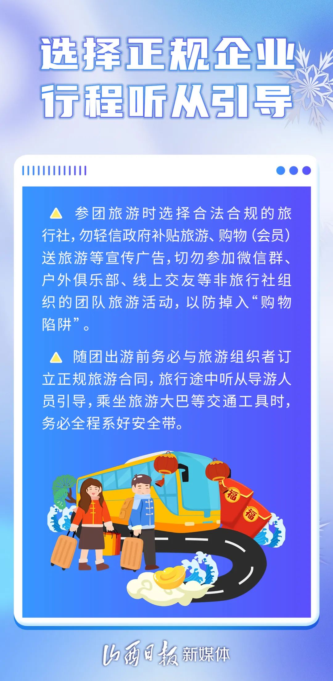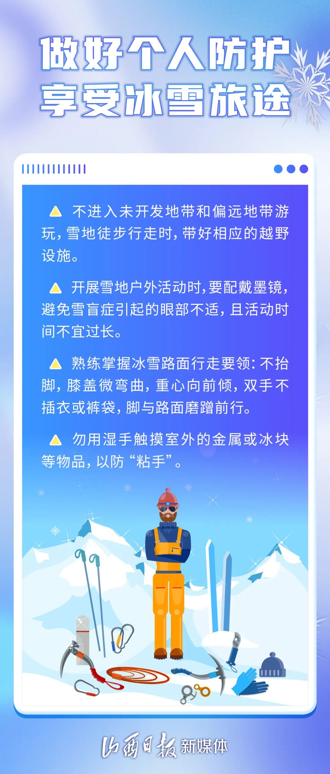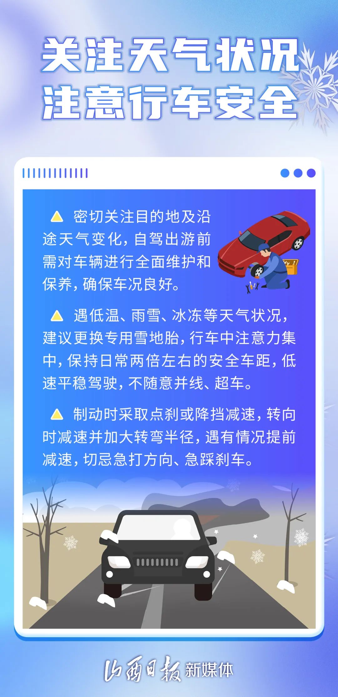 雪花裝點(diǎn)了世界,同時(shí),也為出行帶來了安全隱患。下面是雪天安全出游的小常識(shí),請(qǐng)仔細(xì)閱讀。
