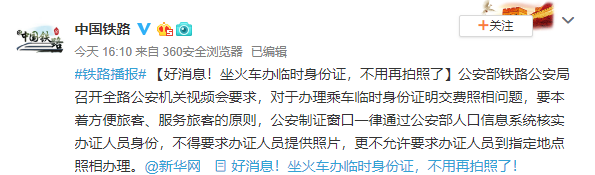 人民網北京5月8日電 據(jù)中國鐵路總公司官方微博消息,公安部鐵路公安局召開全路公安機關視頻會要求,對于辦理乘車臨時身份證明交費照相問題,要本著方便旅客、服務旅客的原則,公安制證窗口一律通過公安部人口信息系統(tǒng)核實辦證人員身份,不得要求辦證人員提供照片,更不允許要求辦證人員到指定地點照相辦理。