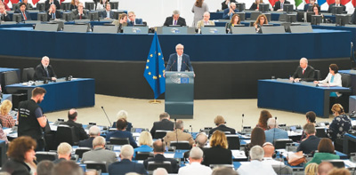 2018年9月12日,歐盟委員會(huì)主席容克(中)在法國(guó)斯特拉斯堡歐洲議會(huì)發(fā)表“盟情咨文”。主題為“歐洲主權(quán)時(shí)刻”,強(qiáng)調(diào)歐洲需要在塑造全球事務(wù)中發(fā)揮作用,包括提升歐元的國(guó)際地位等。(新華社/法新社)