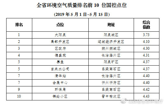 環(huán)境空氣質(zhì)量較好的前10個(gè)點(diǎn)位(從第1名至第10名)依次為:陽泉城區(qū)大陽泉點(diǎn)位、運(yùn)城經(jīng)濟(jì)開發(fā)區(qū)禹都開發(fā)區(qū)點(diǎn)位、朔州朔城區(qū)區(qū)政府點(diǎn)位、長(zhǎng)治潞州區(qū)德盛苑點(diǎn)位、陽泉礦區(qū)賽魚點(diǎn)位和呂梁離石區(qū)自來水公司點(diǎn)位(并列第5)、長(zhǎng)治潞州區(qū)清華站點(diǎn)位和忻州忻府區(qū)會(huì)展中心點(diǎn)位(并列第7)、呂梁離石區(qū)環(huán)保局點(diǎn)位、晉中榆次區(qū)錦綸小區(qū)點(diǎn)位。