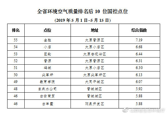 環(huán)境空氣質(zhì)量較差的后10個(gè)點(diǎn)位(從倒數(shù)第1名至倒數(shù)第10名)依次是:太原晉源區(qū)金勝點(diǎn)位、太原小店區(qū)小店點(diǎn)位、太原杏花嶺區(qū)巨輪點(diǎn)位、太原晉源區(qū)晉源點(diǎn)位、太原小店區(qū)塢城點(diǎn)位、太原尖草坪區(qū)尖草坪點(diǎn)位、大同平城區(qū)教育學(xué)院點(diǎn)位、晉城城區(qū)自來水公司點(diǎn)位、陽泉開發(fā)區(qū)白羊墅點(diǎn)位和晉城城區(qū)白云商貿(mào)點(diǎn)位(并列倒數(shù)第9)。