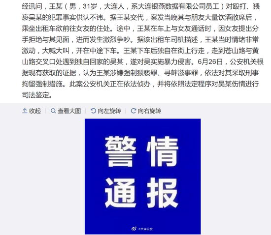 經(jīng)訊問,王某(男,31歲,大連人,系大連銀燕數(shù)據(jù)有限公司員工)對毆打、猥褻吳某的犯罪事實(shí)供認(rèn)不諱。據(jù)王某交代,案發(fā)當(dāng)晚其與朋友大量飲酒散席后,乘坐出租車欲前往女友的住處。途中,王某在車上與女友通話時(shí),因女友提出分手拒絕與其見面,進(jìn)而發(fā)生激烈爭吵。據(jù)該出租車司機(jī)描述,王某當(dāng)時(shí)情緒非常激動(dòng),大喊大叫,并在中途下車。王某下車后獨(dú)自在街上行走,走到蒼山路與黃山路交叉口處遇到獨(dú)自回家的吳某,遂對吳實(shí)施暴力侵害。6月26日,公安機(jī)關(guān)根據(jù)現(xiàn)有獲取的證據(jù),認(rèn)為王某涉嫌強(qiáng)制猥褻罪、尋釁滋事罪,依法對其采取刑事拘留強(qiáng)制措施。此案公安機(jī)關(guān)正在依法偵辦,并將依照法定程序?qū)悄硞檫M(jìn)行司法鑒定。