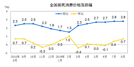 人民網(wǎng)北京9月10日電 (楊曦)國家統(tǒng)計局今日公布數(shù)據(jù)顯示,2019年8月份,全國居民消費價格(CPI)同比上漲2.8%,與上月持平;8月份CPI環(huán)比上漲0.7%,漲幅略有擴大。1——8月平均,CPI同比上漲2.4%。