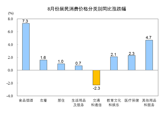 8月份,食品煙酒價格同比上漲7.3%,影響CPI(居民消費價格指數(shù))上漲約2.14個百分點。其中,畜肉類價格上漲30.9%,影響CPI上漲約1.31個百分點(豬肉價格上漲46.7%,影響CPI上漲約1.08個百分點);鮮果價格上漲24.0%,影響CPI上漲約0.39個百分點;禽肉類價格上漲9.6%,影響CPI上漲約0.12個百分點;雞蛋價格上漲3.8%,影響CPI上漲約0.02個百分點;水產(chǎn)品價格上漲1.5%,影響CPI上漲約0.03個百分點;糧食價格上漲0.7%,影響CPI上漲約0.01個百分點;鮮菜價格下降0.8%,影響CPI下降約0.02個百分點。