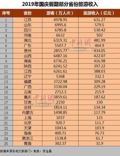 中新網(wǎng)客戶端北京10月9日電(記者 李金磊)“十一”黃金周結(jié)束了,各省份國(guó)慶假期旅游經(jīng)濟(jì)數(shù)據(jù)也陸續(xù)公布。截至10月8日,至少25個(gè)省份公布了國(guó)慶假期旅游收入情況。其中,江蘇省以631.27億元位居首位。
