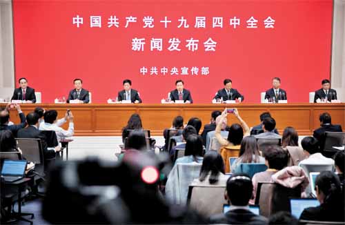 11月1日,中共中央宣傳部在北京舉行中國共產(chǎn)黨十九屆四中全會(huì)新聞發(fā)布會(huì),請(qǐng)中央宣傳部分管日常工作的副部長、中央政策研究室副主任王曉暉,中央政策研究室分管日常工作的副主任江金權(quán),中央財(cái)經(jīng)委員會(huì)辦公室分管日常工作的副主任韓文秀,全國人大常委會(huì)法工委主任、港澳基本法委主任沈春耀,司法部黨組書記、副部長袁曙宏,全國政協(xié)副秘書長舒啟明介紹有關(guān)情況,并答記者問。中央宣傳部副部長、國務(wù)院新聞辦公室主任徐麟主持新聞發(fā)布會(huì)。新華社記者 金立旺 攝