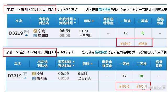 按照5.5折最低折扣,目前蘭州到西安的票價為174.5元,在最低價時,或將只需96元。然而,票價也并不是都處于降價趨勢,對于部分列車段而言,票價也出現(xiàn)了上升的情況。以寧波開往溫州的G2343次列車為例,11月30日,該車的商務座288元,一等座154元,二等座96元;而12月1日,該車的票價商務座、一等座、二等座分別上漲17元、9元和6元,票價出現(xiàn)了小幅上漲。