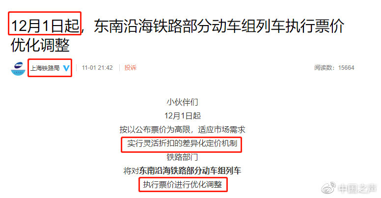 據(jù)中國之聲報道: “雙十一”將至,這兩天,一條“高鐵”也要參加“雙十一”的消息引發(fā)不少人的關注。近期,上海、成都、蘭州、廣州、南寧等鐵路局集團公司陸續(xù)發(fā)布消息,將要對票價進行調(diào)整。當然,說高鐵參加“雙十一”只是個玩笑話。首先,這調(diào)價可不是從11月11號開始;其次,雖然最高折扣達到5.5折,但總體來看,票價有升有降,可不是一味“搞促銷”。