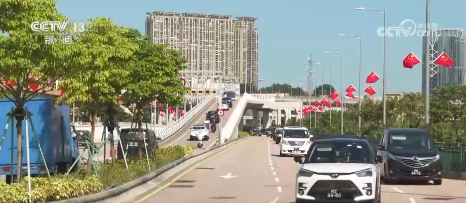 在澳門的主要街道、出入境口岸等地,鮮艷的五星紅旗迎風(fēng)飄揚(yáng),在藍(lán)天、綠樹的映襯下,構(gòu)成了一道道亮麗的風(fēng)景線,為城市增添了喜慶祥和的國慶氛圍。