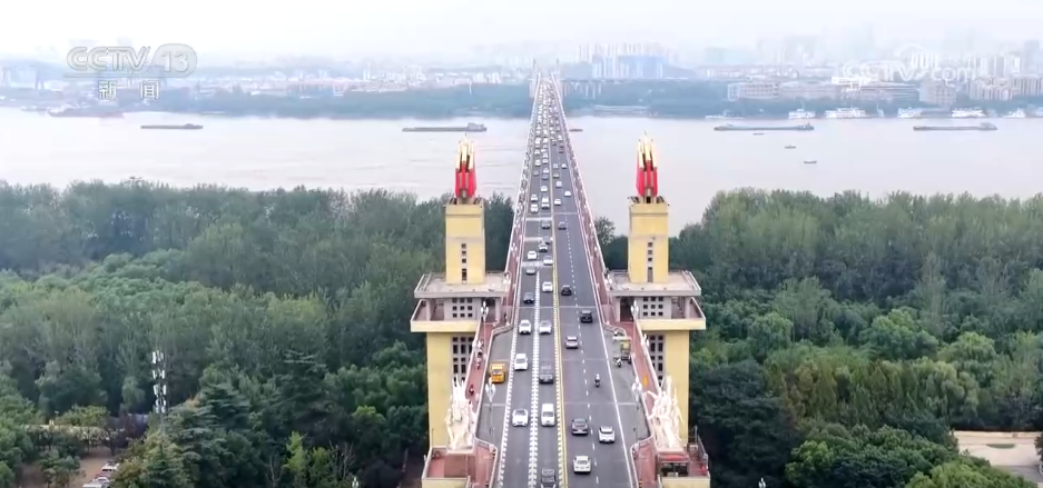 在江蘇南京,南京長江大橋裝扮一新,喜迎國慶。公路橋橋頭堡周邊安排了花卉布展。花壇以黃色孔雀草為背景,明亮耀眼,搭配一串紅組成的紅色花卉飄帶,烘托出喜慶的節(jié)日氛圍。