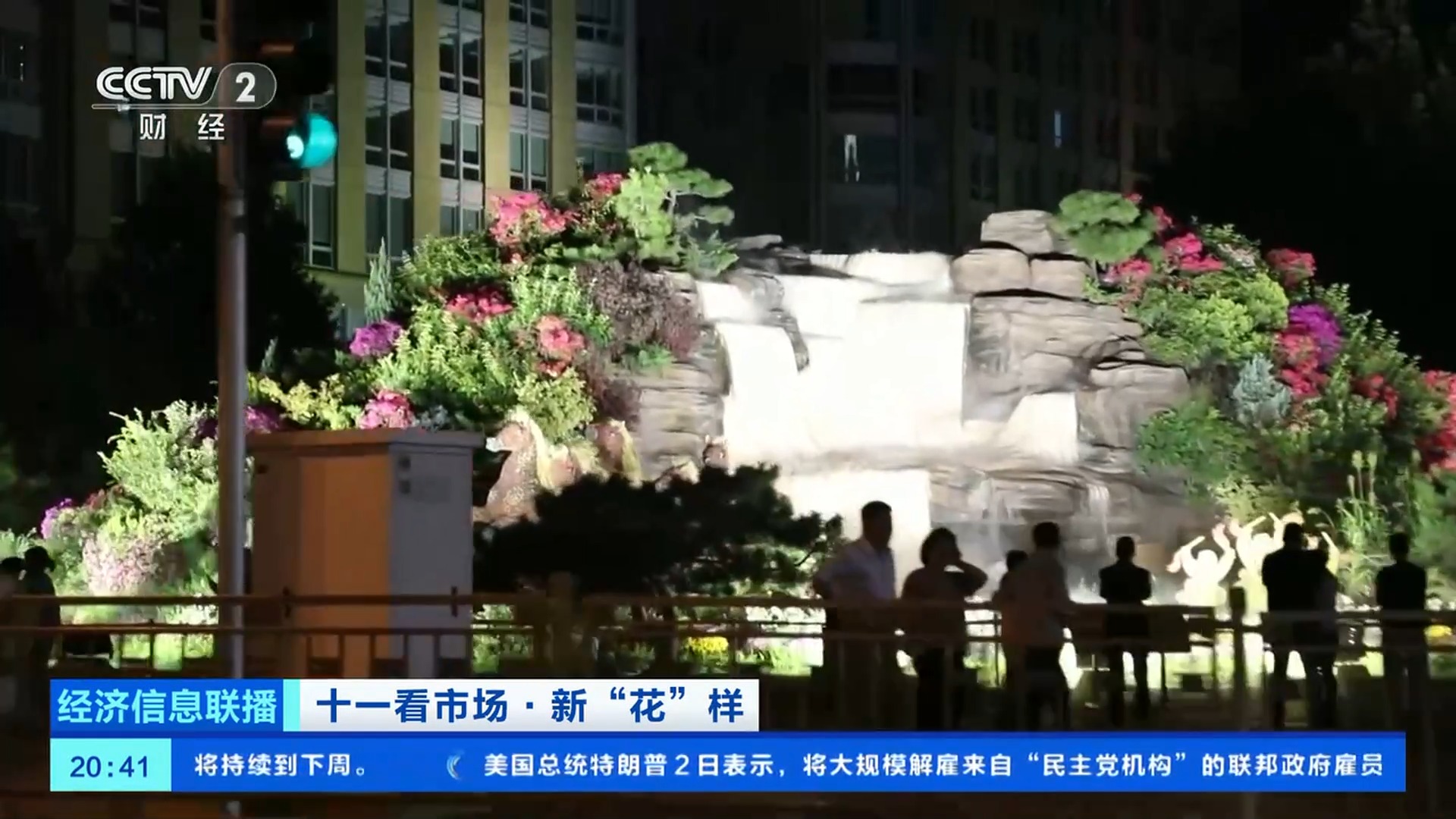 總臺(tái)央視記者 王聞聰:今年北京天安門廣場(chǎng)中心花壇的大花籃和長(zhǎng)安街沿線的10組立體花壇,都在國(guó)慶中秋假期增添了夜間照明設(shè)施,讓夜晚的花壇更加引人注目。北京東單東南角的“黃河贊歌”立體花壇,也被稱為是“會(huì)唱歌的花壇”。在花壇上不僅能看到微觀的壺口瀑布、奔騰的駿馬、載歌載舞的人群,還有水霧、音樂(lè)等聲光電技術(shù),更加逼真地還原了黃河之水天上來(lái)的氣勢(shì)。晚上八點(diǎn),這里仍有大量游客前來(lái)拍照打卡。