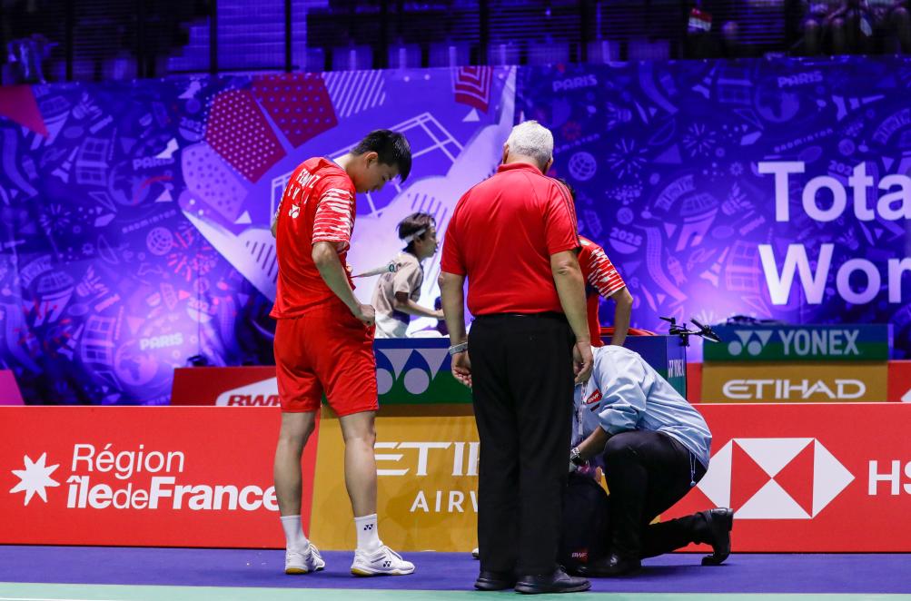 8月27日,中國(guó)選手馮彥哲(左)在比賽中接受治療。新華社記者 張帆 攝