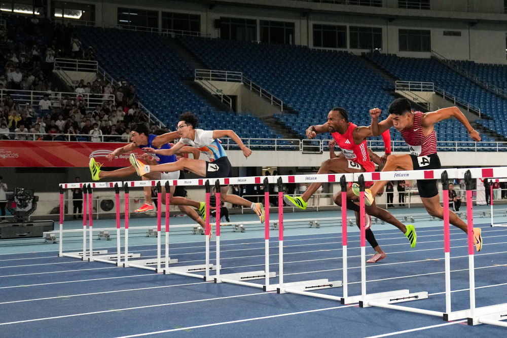 9月7日,日本選手阿部竜希(左一)、中國(guó)選手徐卓一(左二)和陳圓將(右一)在男子110米欄比賽中。新華社記者 鞠煥宗 攝