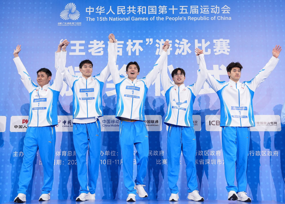 11月10日,冠軍浙江隊選手和教練在頒獎儀式上。當日,第十五屆全國運動會游泳項目男子4X100米自由泳接力決賽在深圳舉行。新華社記者 杜宇 攝