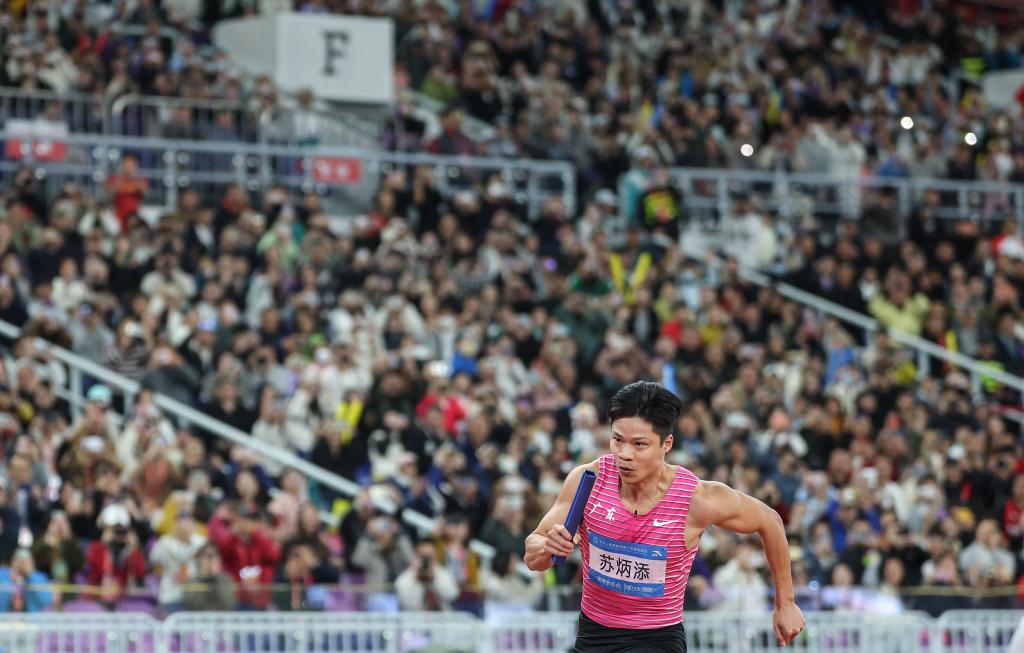 當(dāng)日,田徑項(xiàng)目依然是金牌大戶,共產(chǎn)生12枚金牌。36歲的男子100米亞洲紀(jì)錄保持者蘇炳添成為全場焦點(diǎn),他在家門口的賽道上跑完了職業(yè)生涯的最后100米,帶領(lǐng)一眾“00后”隊(duì)友為廣東隊(duì)奪得男子4×100米接力第四名。盡管未能幫助家鄉(xiāng)隊(duì)伍站上領(lǐng)獎(jiǎng)臺,但蘇炳添仍贏得了滿場掌聲。