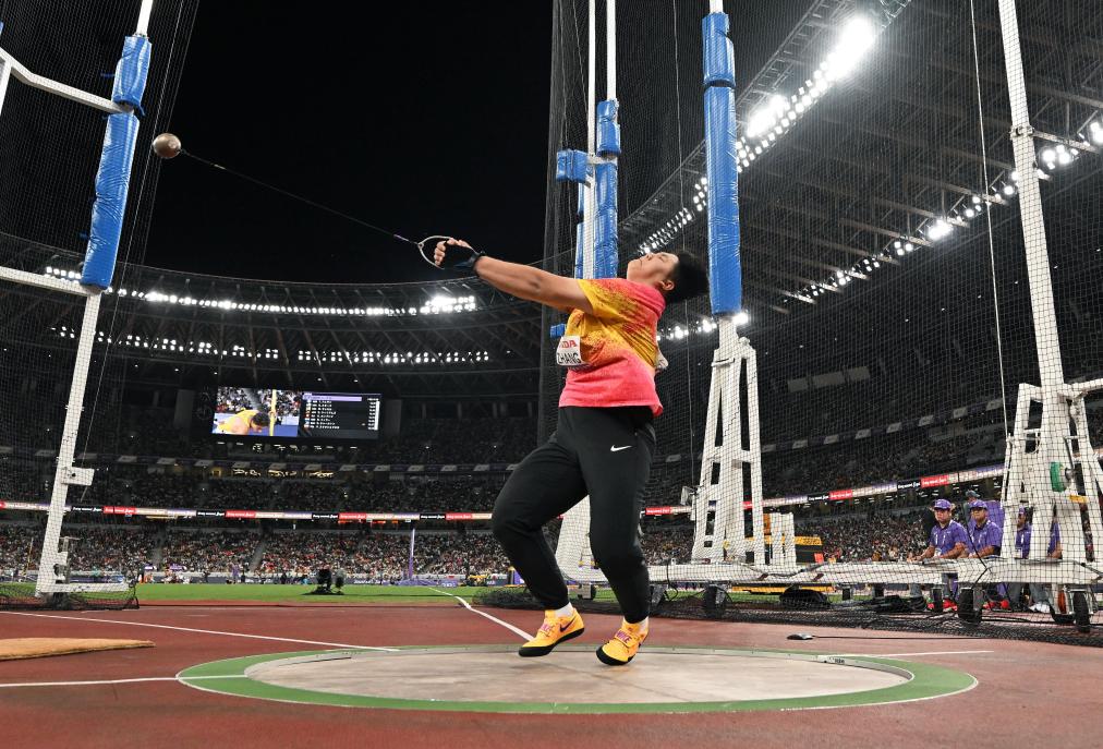 9月15日,2025年世界田徑錦標賽女子鏈球決賽在日本東京舉行,圖為中國選手張家樂在比賽中試投。新華社記者 宋彥樺 攝