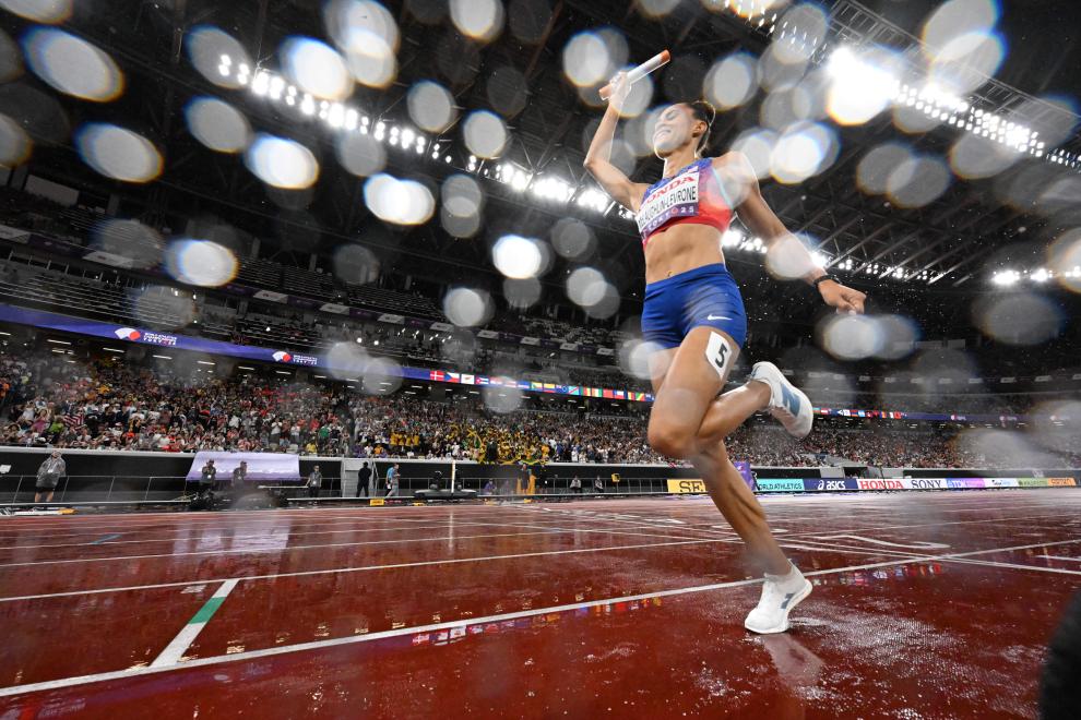 9月21日,2025年世界田徑錦標賽女子4x400米接力決賽在日本東京舉行,圖為美國隊第四棒選手麥克勞林在賽后慶祝奪冠。新華社發(fā)(呂小煒攝)