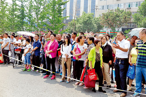 考場外,烈日炎炎,來自四面八方的考生家長們在樹蔭下、街道旁或靜靜地等候,或相互交流有關(guān)孩子們的話題,其緊張的心情,一點也不亞于考場內(nèi)正在考試的考生們??键c處,各愛心團體、商家搭亭設(shè)點,向考生和家長們免費贈送礦泉水、降暑飲料、學(xué)習(xí)資料,還有專車等待免費接送考生。也有不少教育培訓(xùn)機構(gòu)和學(xué)校組織人員向家長們發(fā)放資料,推介各自的教育特色和辦學(xué)水平。交警們堅守崗位,在烈日下疏導(dǎo)交通,各考點周邊交通環(huán)境秩序井然。