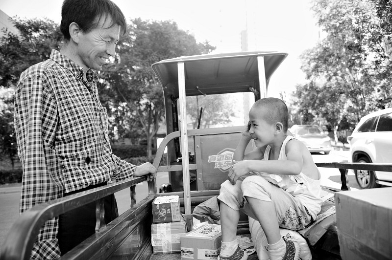 “您好!快遞來了,請下樓接收您的快遞……”這是一位很特別的“快遞小哥”,他叫王志偉,今年7歲。他的爸爸是一名快遞員,名叫王貴生,今年49歲,山西靜樂人,右臂殘疾。暑假來了,為了能和爸爸在一起,小志偉就跟著爸爸每天穿梭在城市的大街小巷。爸爸負(fù)責(zé)拆件、分揀,兒子負(fù)責(zé)打電話通知客戶。