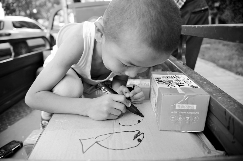 快遞員王貴生,今年49歲,靜樂人,右臂殘疾。7歲的兒子小志偉放暑假后,就跟著他每天穿梭在太原的大街小巷送快遞。爸爸負(fù)責(zé)拆件、分揀,兒子負(fù)責(zé)打電話通知客戶。 (胡續(xù)光 攝)