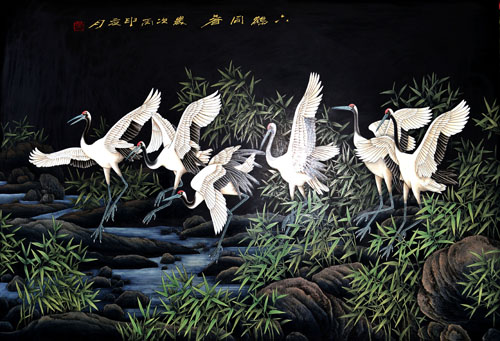 《六鶴同春》推光漆畫
