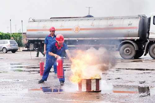首先上場的是泉鑫石油運(yùn)輸有限公司,他們演練的科目是汽柴油滅火救援。其一是假定油罐車在缷油時(shí)發(fā)生燃燒事故,接到報(bào)警后,消防車迅速趕到現(xiàn)場,連接好水槍做好滅火準(zhǔn)備;應(yīng)急搶險(xiǎn)隊(duì)、車輛搶救隊(duì)、后勤保障隊(duì)也同時(shí)到達(dá)現(xiàn)場,拉起警戒繩,各司其職進(jìn)行應(yīng)急處置,成功將險(xiǎn)情排除并清理現(xiàn)場。其二是油罐車在裝油時(shí)發(fā)生進(jìn)油口著火險(xiǎn)情,各隊(duì)?wèi)?yīng)急救援人馬接到警情急速趕到事發(fā)現(xiàn)場,放好三角警示架、拉起警戒繩禁止無關(guān)人員靠近,用消防車水槍對油罐車車體進(jìn)行冷卻處理,利用干粉滅火和石棉滅火等技法,最終成功處置險(xiǎn)情。