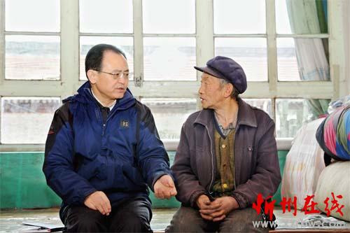 圖為市委書記李俊明在寧武縣涔山鄉(xiāng)大石洞村貧困戶李寶林家了解情況。