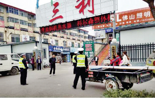 圖為三片區(qū)分指揮部工作人員在三利裝飾市場(chǎng)督查創(chuàng)衛(wèi)工作。
