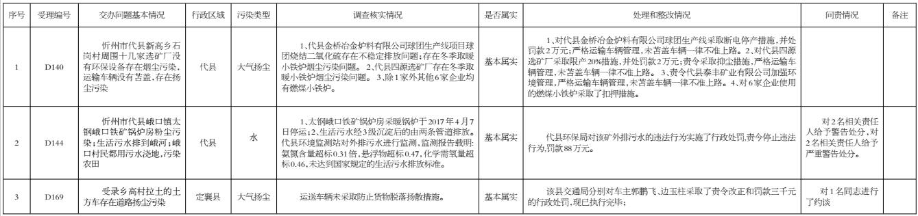 我市高度重視,立即組織查處,截至5月4日,督辦的3件群眾反映問題已辦結(jié)。其中,代縣確認(rèn)基本屬實(shí)的2件;定襄縣確認(rèn)屬實(shí)的1件。對(duì)于屬實(shí)已辦結(jié)的環(huán)保問題,分別采取了相應(yīng)處理措施,其中限產(chǎn)停產(chǎn)1件2家、查封扣押1件5家、罰款92.6萬(wàn)元;目前,代縣對(duì)2名相關(guān)責(zé)任人給予警告處分、2名相關(guān)責(zé)任人給予嚴(yán)重警告處分;定襄縣對(duì)1名相關(guān)責(zé)任人進(jìn)行了約談;對(duì)3件群眾反應(yīng)問題調(diào)查處理情況進(jìn)行了信息公開。