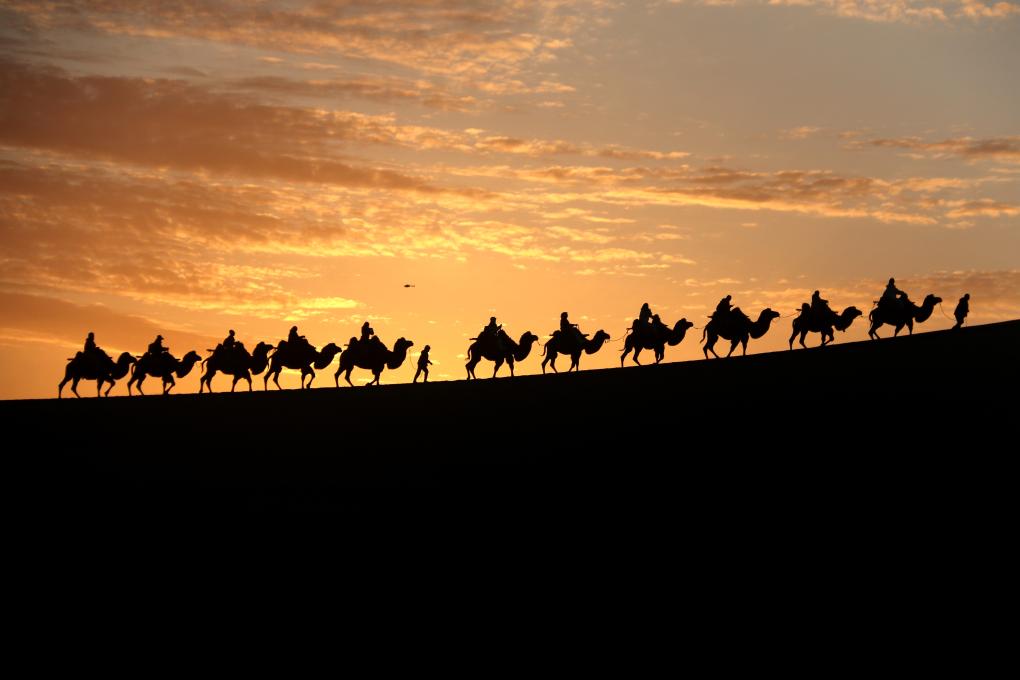 月牙泉是沙漠的眼睛,依舊倒映著漢唐的明月。駝隊(duì)曾經(jīng)從這里經(jīng)過,駝鈴聲串起長安與羅馬的夢。絲綢是流動(dòng)的彩虹,瓷器是凝固的月光,經(jīng)卷里藏著智慧的種子,在歐亞大陸上生根發(fā)芽。