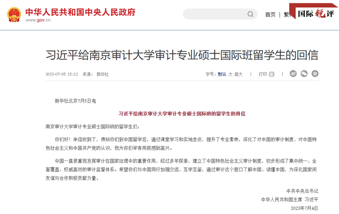 就在前一天,中國國家主席習(xí)近平給這個碩士國際班的留學(xué)生回信,鼓勵他們與中國同行加強(qiáng)交流、互學(xué)互鑒,通過審計這個窗口了解中國、讀懂中國,為深化國家間友誼與合作積極貢獻(xiàn)力量。這封回信讓吳娜班上的37位學(xué)生非常振奮。