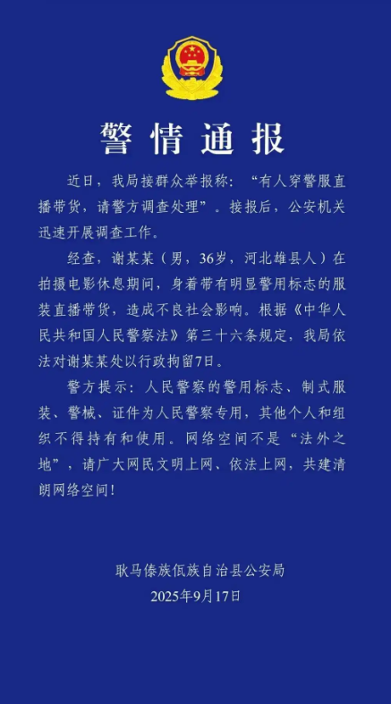 近日,演員謝孟偉(網絡俗稱“嘎子哥”)在直播帶貨過程中身穿警服,被公安機關依法處以行政拘留七日的處罰。該處理結果獲得輿論普遍支持,體現(xiàn)出社會對公權力象征符號神圣性的共同維護。據通報,謝某在電影拍攝休息期間,身著配有警用標志的制式警服公開推銷電子產品,并聲稱“穿警服需通過政審”“公安機關應當配合工作”,企圖利用警服所承載的公信力為其商業(yè)行為背書。