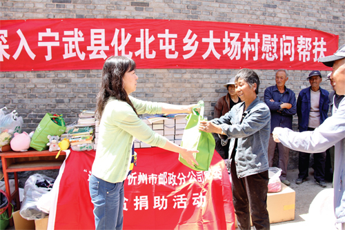 據(jù)悉,大場村距離寧武縣城約40 公里,由于地處山區(qū),經(jīng)濟(jì)和交通狀況較差。自2009 年以來,市郵政分公司每年指派專人在該村定點幫扶,募集款物捐助困難群眾,受到了當(dāng)?shù)卣腿罕姷囊恢潞迷u。圖為捐贈現(xiàn)場。(魯明強(qiáng) 趙崇凱 攝影報道)