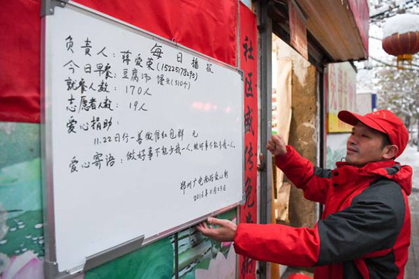 圖說:志愿者在懸掛“每日播報”,將早餐內容、就餐人數等信息公布在愛心粥屋門口(11月23日攝)。圖片來源:新華社