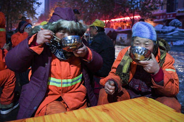 百度貼吧網友“馬克斯基”說:“下雪天路過鄭州廣電南路愛心粥屋,寒風中200多位環(huán)衛(wèi)工人圍坐在一起喝著熱騰騰的粥,有說有笑,我流淚了。此刻,愛心粥屋就是我們‘城市美容師’的家?!?/p>