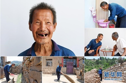 魏連保,男,1949年出生,山西省長治市沁源縣支角村人。獨居的他生活不便,2017年年底,村委會為魏連保在內(nèi)的8位老人修建了一排整齊的新居,并統(tǒng)一安排就餐。 左上:魏連保肖像;右上:魏連保在新居洗臉;右中:魏連保(左)在新居和鄰居李秀成聊天;下右:魏連保在舊居前留影;下中:魏連保在舊居打掃院子;下左:魏連保在舊居為蔬菜澆水(拼版照片,6月18日攝)。 地處晉東南的山西省長治市,位于由太行山、太岳山環(huán)繞而成的上黨盆地中。在群山中、崖壁上,許多村莊自然條件惡劣,基礎(chǔ)設(shè)施落后,脫貧致富是大山深處人們的迫切心愿。 近年來,一場場脫貧攻堅戰(zhàn),在一個個深山村打響。政府全力探索脫貧路徑的同時,山區(qū)百姓因地制宜,靠自己的雙手和智慧走上致富路,交出了一份扎實的脫貧答卷。 記者在太行山、太岳山一路尋訪,記錄下多位70歲老人的生活。這些共和國的同齡人,親歷了山鄉(xiāng)的巨變,見證著長治山區(qū)脫貧攻堅偉大工程的一步步推進(jìn)。 新華社記者 楊晨光 攝
