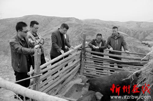 管武平(右一)和村委班子成員察看貧困戶(hù)養(yǎng)的豬。 宿晉陽(yáng) 攝