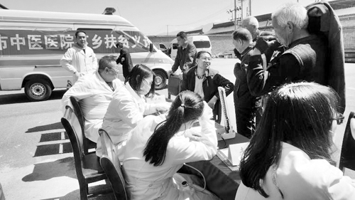 胡家溝村有貧困戶80戶。市委老干部局從2015年開始進(jìn)行幫扶,緊緊圍繞“一戶一名技術(shù)工,做好精準(zhǔn)扶貧”的工作思路,在技能培訓(xùn)、項(xiàng)目實(shí)施、基礎(chǔ)建設(shè)、教育援助、文藝活動(dòng)等方面開展了大量卓有成效的工作,在2016年底取得了整村脫貧的好成績(jī)。這次健康扶貧行動(dòng),是市委老干部局認(rèn)真貫徹全市脫貧攻堅(jiān)大會(huì)精神,鞏固成績(jī)、持續(xù)發(fā)力,不斷推進(jìn)幫扶成果的具體體現(xiàn)。針對(duì)村民對(duì)疾病預(yù)防和治療方面的需求,市委老干部局聯(lián)系市中醫(yī)院組織了義診活動(dòng)。市中醫(yī)院內(nèi)科、外科、心內(nèi)科等多個(gè)科室的9名醫(yī)務(wù)骨干和老專家,為貧困村民把脈問診、開方治療,使106名村民得到診療。
