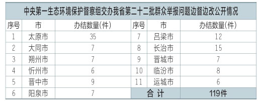 中央第一生態(tài)環(huán)境保護(hù)督察組交辦我省第二十二批群眾舉報(bào)問題119件,辦結(jié)119件。公示119件,其中太原市35件、大同市7件、朔州市7件、忻州市6件、晉中市9件、陽泉市7件、呂梁市12件、長治市15件、晉城市7件、臨汾市8件、運(yùn)城市6件??傻卿浬轿魇∪嗣裾W(wǎng)站或掃描二維碼查閱群眾信訪舉報(bào)轉(zhuǎn)辦和邊督邊改公開情況一覽表。