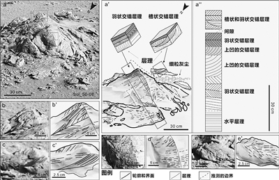 研究團隊發(fā)現(xiàn),祝融段內的巖石通常保留有局部呈透鏡狀的交錯層理組構,以多種小型交錯層理為主,伴隨少量透鏡狀壓扁層理和小型水道結構的沉積構造。其中,組成交錯層理的層系在兩個相反的方向疊覆傾斜,指示雙向古水流環(huán)境。