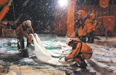 科考隊員們在“雪龍2”號的艉甲板進(jìn)行海洋調(diào)查準(zhǔn)備工作。陳亮宇 攝