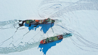 “這次陸緣冰接近2米的厚度,遠(yuǎn)遠(yuǎn)超出了‘雪龍’號破冰能力,也超過了‘雪龍2’號設(shè)計的1.5米破冰水平?!薄把?”號船長肖志民告訴記者,面對挑戰(zhàn),科考隊精心準(zhǔn)備,利用直升機(jī)和無人機(jī)開展多次探冰勘察,制定破冰方案。通過艏艉向連續(xù)破冰、艏向沖撞破冰的方式,“雪龍2”號僅用2天時間,就開辟出長度約16.5海里的陸緣冰區(qū)航道,最終抵達(dá)預(yù)定卸貨點,并將“雪龍”號引航至卸貨點。