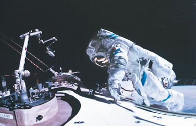 12月21日在北京航天飛行控制中心拍攝的神舟十七號航天員唐勝杰開展艙外操作的畫面。韓啟揚(yáng)攝(新華社發(fā))