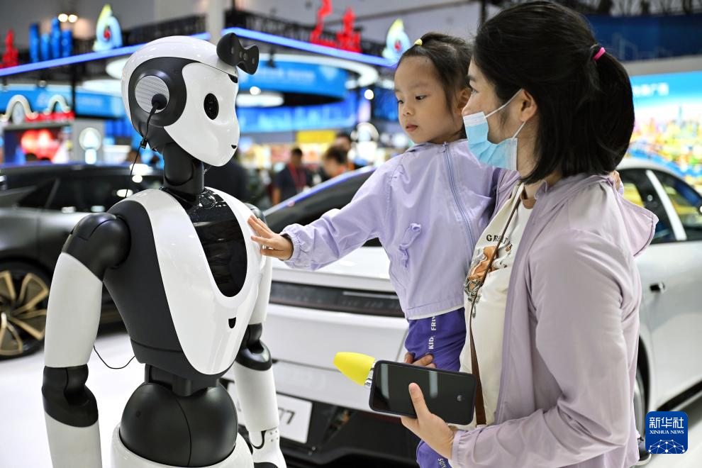 4月15日,觀眾在消博會上與AI人形智能服務(wù)機器人互動。新華社記者 郭程 攝