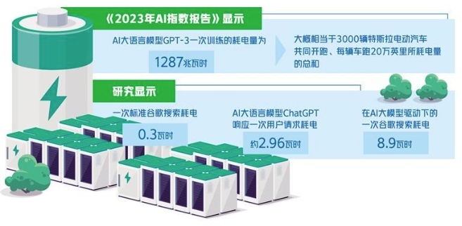 人工智能大模型到底有多耗能?據(jù)斯坦福人工智能研究所發(fā)布的《2023年AI指數(shù)報(bào)告》,AI大語(yǔ)言模型GPT-3一次訓(xùn)練的耗電量為1287兆瓦時(shí),大概相當(dāng)于3000輛特斯拉電動(dòng)汽車(chē)共同開(kāi)跑、每輛車(chē)跑20萬(wàn)英里所耗電量的總和。報(bào)告同時(shí)提出,AI大語(yǔ)言模型GPT-3一次訓(xùn)練,相當(dāng)于排放了552噸二氧化碳。