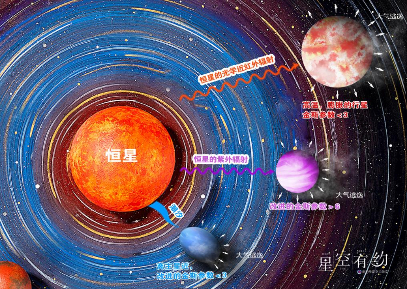 郭建恒說(shuō),在那些低質(zhì)量和大半徑的行星上,若行星有足夠的內(nèi)能或較高溫度,便可驅(qū)動(dòng)大氣逃逸。研究發(fā)現(xiàn)使用經(jīng)典的金斯參數(shù),即行星內(nèi)能和勢(shì)能的比值,就可對(duì)上述逃逸是否發(fā)生做出判斷;對(duì)于內(nèi)能無(wú)法驅(qū)動(dòng)大氣逃逸的行星,該研究通過(guò)引入恒星的潮汐力,定義了一個(gè)改進(jìn)的金斯參數(shù)?!巴ㄟ^(guò)它,我們就能對(duì)恒星潮汐力和極端紫外輻射在驅(qū)動(dòng)大氣逃逸上的角色進(jìn)行區(qū)分。”