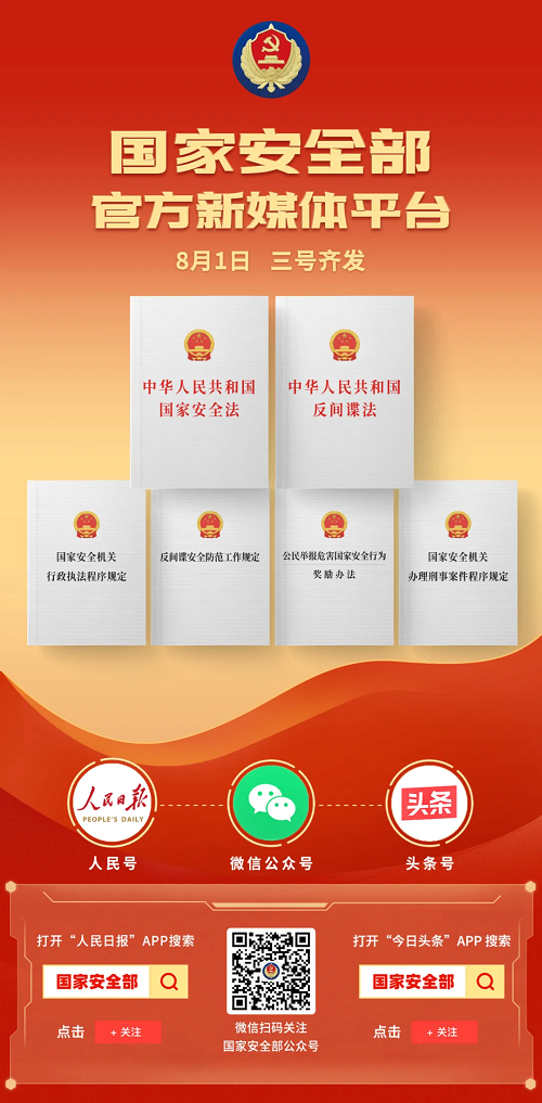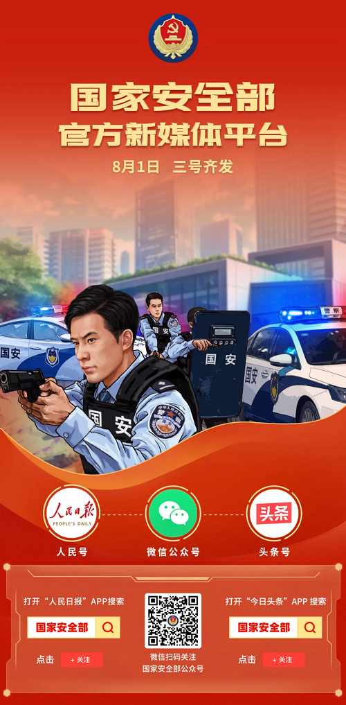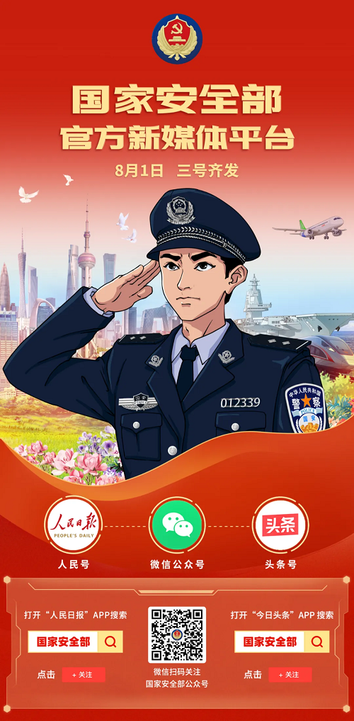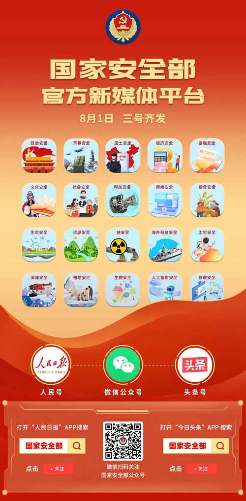 今天,國家安全部頭條號、人民號正式上線了。這是國家安全機(jī)關(guān)新的官方權(quán)威宣傳陣地,與國家安全部官微共同打造國家安全部官方新媒體平臺。歡迎大家關(guān)注國家安全部官方微信公眾號、國家安全部頭條號、國家安全部人民號,感受隱蔽戰(zhàn)線的“神秘”工作、“神奇”事業(yè)、神圣使命!