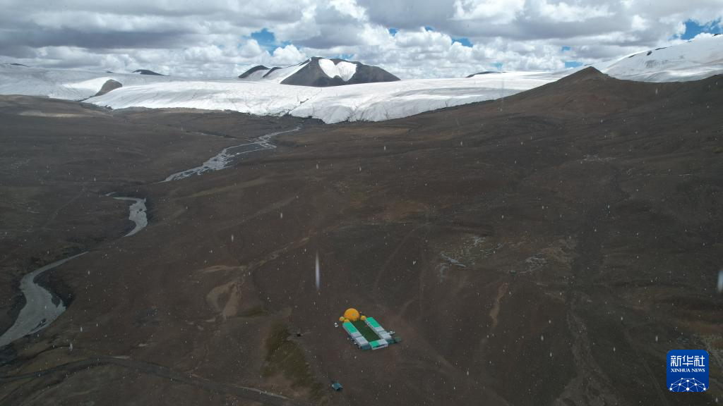 第二次青藏科考海拔最高的冰川末端大營——普若崗日冰原科考主營地(無人機照片)。新華社記者 劉詩平 攝