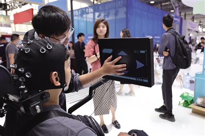 圖為2024服貿會上,工作人員在為參觀者講解使用非侵入式腦機接口技術的腦控神經(jīng)康復訓練機器人。記者 戚曉毅 攝