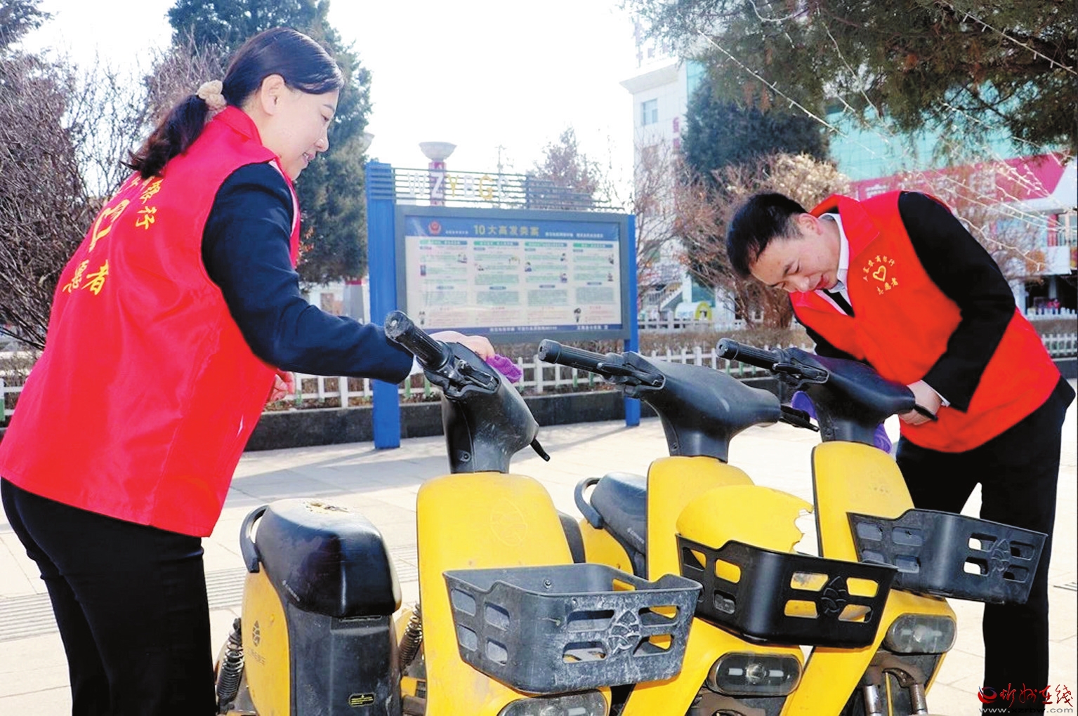 三月春風拂揚柳,雷鋒精神閃光芒。為進一步弘揚雷鋒精神,推動學雷鋒活動常態(tài)化,鞏固提升創(chuàng)衛(wèi)成果,營造和諧優(yōu)美環(huán)境,連日來,五寨農(nóng)商銀行機關黨員志愿服務隊組織開展了“擦亮共享單車,助力文明出行”志愿服務活動。(張家源攝)